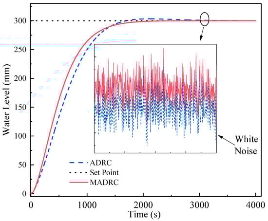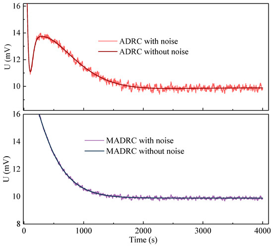 namely, the system parameter a2 = 5.84 × 10−3 in the second-order system (10). We adopted the same controller parameters of ADRC and MADRC, i.e., ωo = 0.03 and ωc = 0.0035, which satisfy the noise reduction condition ωo ≥ ωc ≥ 0.4a2.