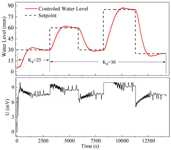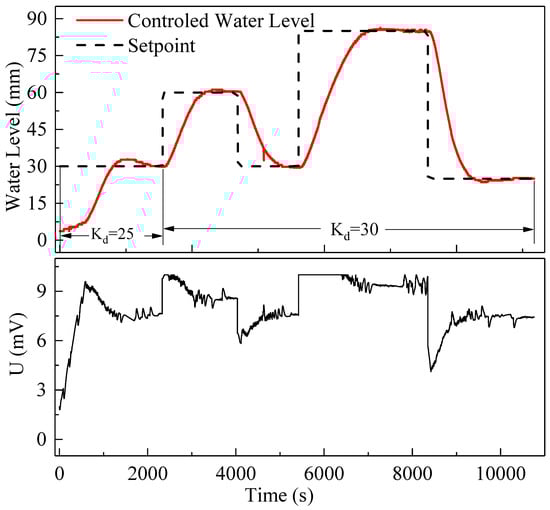 Based on the previous simulation work in Section 4, we applied the well-tuned controller parameters to control the water level of the experimental platform. In order to verify the quantitative relationship between kd and ζ and take Ts into account, kd is set in discrete steps. The other parameters and the structure of the controllers are the same as mentioned in the simulation experiment. In order to fully reflect the effect of the controller, the experiments were set up with multiple groups of positive/negative steps in different amplitudes. Figure 13 and Figure 14 represent the water level tracking performance of ADRC and MADRC controllers, respectively.