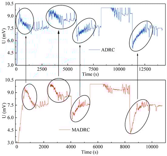 It clearly depicted in Figure 15 that when control variable undergoes a large numerical change, severe fluctuation will occur. However, according to the corresponding circled plots, it is obvious that the fluctuation of control variable is smaller for the MADRC than for the ADRC. Moreover, on the basis of model information and controller parameters, the parameters satisfy the noise reduction conditions mentioned in this paper: ωo ≥ ωc ≥ 0.4a2. This shows that the MADRC indeed has a better noise reduction capability compared with the ADRC under the same noise reduction condition. As in the simulation experiments, the feasibility of the noise reduction condition is also demonstrated, which is quite useful in industrial applications for its friendliness to actuators.