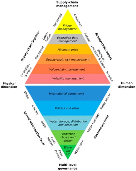 Historically, interventions in response to water shortages have mostly aimed at increasing either water supply or water-use efficiency, interpreting efficiency narrowly as the ratio of output to input [6]. Unfortunately, the scope for finding sustainable, equitable, and resilient solutions through these types of interventions is limited. Moreover, because of the complexities and feedbacks in human-environmental interactions, it is less than straightforward to understand the redistributive effects of building reservoirs [7] and promoting micro-irrigation technologies [8]. Water demand is projected to grow because of continued population and economic growth while water availability in critical periods is expected to decrease in many places because of climate change [9] so that the need to act and mitigate water scarcity only becomes more pressing. Apart from actors in water resource management (e.g., irrigation boards, water boards, river basin committees, water ministries) and agricultural water management (e.g., farmers, farmer associations, agricultural ministries), there are multiple others that have an effect on the way we mobilize the world’s water resources for producing the goods and services we wish to consume. Patterns of water use, scarcity, and pollution are intricately related to the way we have organized our economies. As a result, wise water governance inevitably means that we have to look beyond managing water resources use itself. We need to consider also indirect drivers of water problems, like incentives to produce water-intensive products in water-scarce regions for export, governmental subsidy programs to shift from fossil fuels to biofuels, and lack of mechanisms to reduce wastage of food along all stages of the supply chain. Next, we need to look at ways in which actors outside the water field can contribute to the indirect solution of the water problems. Figure 1 shows the spectrum of collective action that we need to consider to understand how we can effectively reduce water footprints of human activities to sustainable levels, by interventions through different actors along supply chains and at different scale levels. We can distinguish different types of interventions: