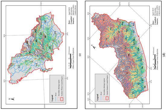 (a) Digital Elevation Model (DEM) of the Northern Region. The altitude above mean sea level (MSL) varies between 544 and 2089 m. The river network shown is characterized by drainage densities (DD) at a catchment level ranging between 0.09 and 0.24. (b) DEM of the Central Region. The altitude above MSL varies between 993 and 2130 m. The river network shown is characterized by drainage densities (DD) at a catchment level ranging between 0.11 and 0.23. (c) DEM of the Southern Winter Coastal Region. The altitude above MSL varies between 0 and 2235 m. The river network shown is characterized by drainage densities (DD) at a catchment level ranging between 0.17 and 0.28. (d) DEM of the Eastern Summer Coastal Region. The altitude above MSL varies between 0 and 3420 m. The river network shown is characterized by drainage densities (DD) at a catchment level ranging between 0.14 and 0.30.