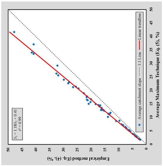 The average catchment slope results estimated using the Empirical method (Equation (4)) and Average Maximum Technique (Equation (5)) applicable to each catchment are listed in Table A1, Table A2, Table A3 and Table A4 in Appendix A and a scatter plot is shown in Figure 3.