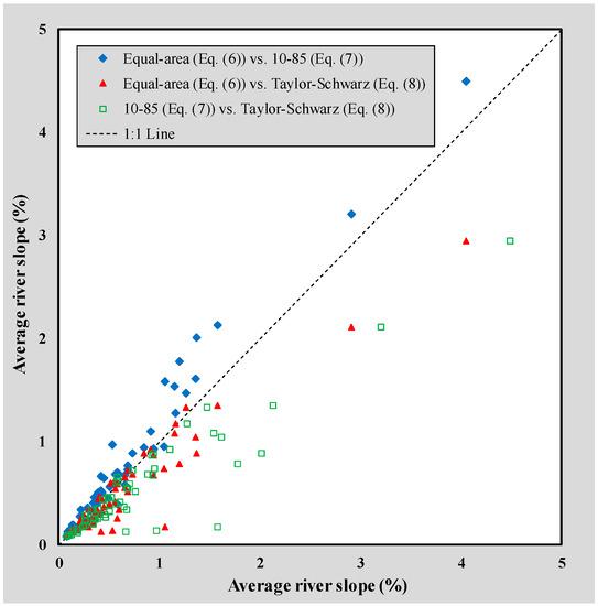Scatter plot of the average river slope values estimated using Equations (6)–(8). The degree of association (r2 values) between the different methods range between 0.85 (Equation (7) vs. Equation (8)) and 0.97 (Equation (6) vs. Equation (7)).