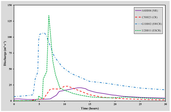 In contrast to the single-peaked hydrographs associated with ‘small’ catchments as illustrated in Figure 5, the multi-peaked hydrographs shown in Figure 6a,b are due to an increasing heterogeneity of geomorphological catchment characteristics and the spatial–temporal rainfall distribution as the catchment scale increases.