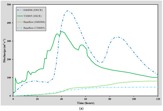In order to elaborate on above discussion related to the combination of geomorphological catchment characteristics and the influence thereof on catchment response time, examples of hydrographs representative of the ‘average conditions’ (cf. Table A1, Table A2, Table A3 and Table A4, Appendix A) at a catchment level in two distinctive area ranges (e.g., A < 200 km2 and 2500 km2 ≤ A < 6500 km2) in each climatological region are presented in Figure 5 and Figure 6a,b, respectively.