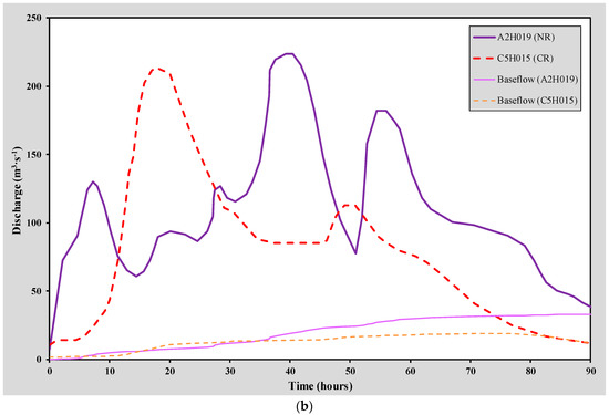 Ultimately, it could be argued that the type, spatial and temporal distribution of rainfall govern the overall catchment response time at medium to large catchment scales, as illustrated in Figure 6a,b, respectively. However, the spatial and temporal distribution of rainfall are not regarded as ‘geomorphological catchment characteristics’ and hence, the quantitative investigation thereof is beyond the scope of this study. However, in terms of rainfall type and spatial distribution, the convective summer rainfall events in the semi-arid catchments A2H019 (NR) and C5H015 (CR) will typically be more non-uniform with an intermittent spatial distribution compared to the orographic or frontal winter rainfall in catchment H4H006 (SWCR) and the all-year rainfall in catchment T3H005 (ESCR), respectively. Although not being analyzed quantitatively, such general conclusions could be drawn from Figure 6a,b based on the differences evident in the hydrograph shape, i.e., the shorter catchment response times (TPxi < 25 h), lower direct runoff volumes (QDxi ≤ 30 × 106 m3) and well-defined peaks (QPxi ≤ 215 m3·s−1) associated with much larger catchment areas (A > 5900 km2) in the case of catchments A2H019 and C5H015 (Figure 6b) as opposed to the much larger direct runoff volumes (QDxi ≈ 74 × 106 m3) and peak flows (QPxi > 350 m3·s−1) associated with smaller catchment areas less than 2900 km2 in the case of catchments H4H006 and T3H005 (cf. Figure 6a).