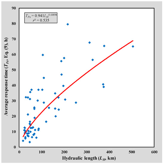 Relationship between the average catchment response time (Equation (9)) as the criterion variable and the hydraulic length (LH) as the predictor variable in the 65 catchments.