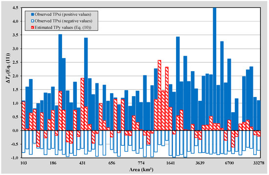 In comparing the estimated TPy (Equation (10)) with the observed TPx (Equation (9)) values, an improved coefficient of multiple-correlation (Ri2) = 0.62 and standard error (SEy) = 11.9 h were obtained. However, the SEy results must be clearly understood in the context of the actual response time associated with catchment area, as the impact of such error in the TPy estimates might be critical in a small catchment, while being less significant in a larger catchment.