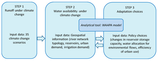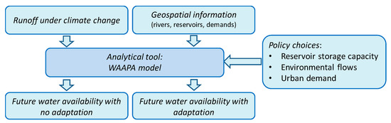 Figure 1. The analysis consisted of three steps: estimation of runoff under climate change, calculation of water availability changes due to changes in runoff, and evaluation of the adaptation choices that can modify the distribution of water availability under climate change. The adaptation choices included changes in reservoir storage, environmental flow requirements, and efficiency of urban water use. The analytical tool to estimate water availability and adaptation choices was the Water Availability and Adaptation Policy Analysis (WAAPA) model [