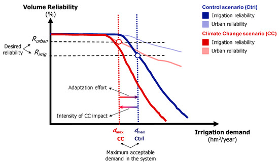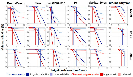 irrig.) gross volume reliabilities for urban and irrigation demands, respectively. Water availability for irrigation is the minimum demand value that satisfies both requirements simultaneously. Water availabilities for irrigation in the current and climate change scenarios are represented by vertical lines of blue and red colors. The comparison between the water availability for irrigation in control and in the climate change scenario provides a proxy variable to estimate the effort of adaptation to climate change. If the objective of water policy is to maintain adequate reliability for both urban (R