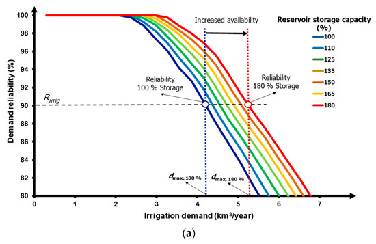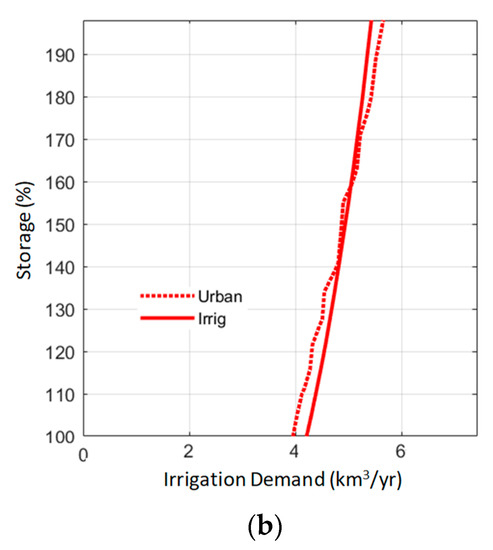 Figure 5a represents the demand-reliability curve of the irrigation demand for varying values of reservoir storage capacities, expressed as a percentage of current values. Water availability was increased with the increase in the reservoir capacity. If we applied the same methodology to the demand-reliability curve of the urban demand, we could obtain the evolution of water availability determined by the reliability of urban demand.