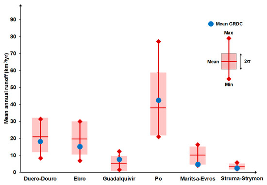 Figure 6 shows a very large dispersion in mean annual runoff in most basins with a strong bias. Reservoir capacities in the basins have been designed accounting for local hydrology and water needs, and therefore the bias of the climate change scenarios had to be corrected in order to properly represent current water management in the basin. We used GRCD mean annual flow values for bias correction in the historical period and applied the same correction coefficient for each model to the long-term scenarios.