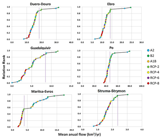 36]. Most projections imply a reduction of mean annual flow for the six basins under study, although there is no apparent correlation between the emission scenario and the projected evolution of the mean annual flow. Our results agree with other studies that reported mean annual runoff projections [