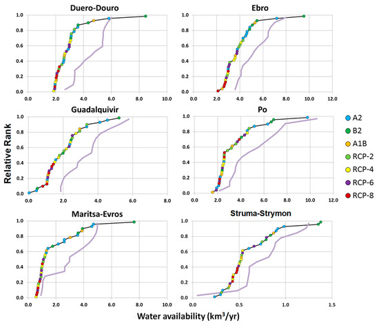 Figure 8, which presents the ranked values of water availability in the historical period (CTL: 16 model runs; purple line) and in the long-term projection (35 model runs; black line). The uncertainty in the estimation of water availability is large, even in the historical period, where streamflow from all models has been bias-corrected to produce the same mean annual flow in each basin. It suggests that the differences in the representation of the hydrologic regimes among the models have an important influence on the potential water availability estimation. Relatively small differences in seasonality or interannual variability may produce important differences in water availability. All curves corresponding to the long-term projection of water availability are clearly to the left of the curves corresponding to the historical period, suggesting a clear signal of reduction of water availability. By comparing the range of obtained values for mean annual flow (