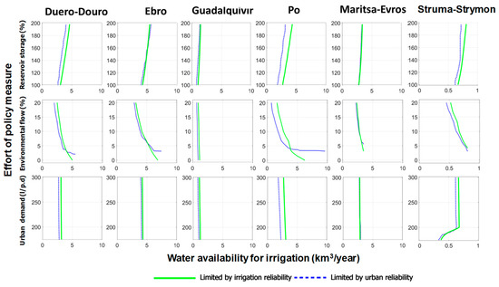 Figure 10. Results correspond to the model KNMI, which provides intermediate values for projected water scarcity. The analysis for reservoir storage was performed by increasing the capacity of existing reservoirs in the basins progressively (in 15 stages), from 100% to 200% of current value, and repeating the analysis of the demand reliability curve for each stage. The analysis of environmental flow modification was performed by considering ecological flows ranging from the 20% percentile of the marginal distribution of monthly flows to 0%, in seven stages. The reference situation assumed for the control scenario is 10%, so in this case, the policy might increase or decrease water availability with respect to current conditions. The analysis for urban demand efficiency was performed by considering diminishing values of the maximum allowable per capita urban demand. The starting value was 300 l/pd and was reduced to 175 l/pd in six stages.