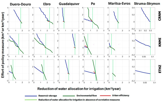 The plots correspond to the most limiting case between urban and irrigation demands. The lines correspond to the evolution of the required adaptation effort as a function of the intensity of the application of the policy. The policy objective (adequate supply reliability) can be achieved with several strategies: only through demand reduction (horizontal), only through the combined policy (vertical), or through a combination of both. Through this Figure, we may evaluate the intensity, range, and efficiency of the measure. The intensity (effort) corresponds to the degree of implementation of the policy measure that would be required to avoid demand reduction entirely. It is represented by the value corresponding to the point at which the line (corresponding to any policy measure) crosses the vertical axis (and corresponds to zero reduction of water allocation for irrigation). For instance, a reduction of 2.2 km3/yr on environmental flows would avoid demand reductions in Duero-Douro basin (KNMI model). The range is determined by the length of the projection of the entire line on the horizontal axis. This represents the maximum extent to which the reduction can be avoided if the maximum intensity of the policy measure was applied. For instance, for the Duero-Douro basin and the KNMI model, the range corresponding to the reservoir volume measure goes from 1.4 km3/yr of reduction of water allocation for irrigation (current reservoir volume is maintained in the future) to 0.1 km3/yr of water reduction when the policy action is applied at the maximum intensity analyzed (by increasing the capacity of existing reservoirs to 200% of current value, 3.2 km3). Otherwise, if the CRNM model is selected (Duero-Douro basin), the effectiveness of the three correlative policies is very similar because the three lines are almost superimposed. However, the range is very different. The range of urban use efficiency is very small compared to the amount of irrigation demand that has to be reduced. The range of storage increment is also limited, especially if we account for the fact that storage has been doubled in our analysis. The Guadalquivir basin is significantly different because the little scope for action and the very high slope of the lines imply that the only possible adaptation measure among those considered in this study is the reduction of the irrigation demand. The range also indicates to what extent the proposed measure can be implemented. While there is no limit for the increase in reservoir storage, both the improvement of urban use efficiency and the reduction of allocation to environmental flows clearly have a limit. In many cases, full avoidance can be achieved through the range of values analyzed for the policy measures, but in other cases, the lines do not reach the vertical axis, meaning that reduction cannot be fully avoided. This is the case of increased urban water use efficiency, which can only avoid a small fraction of the reduction. The efficiency is represented by the inverse of the slope of the lines, which describes the ratio between the policy result (horizontal axis) and the policy effort (vertical axis). Vertical lines are inefficient because a large effort in policy would be required to produce a comparatively small result. Conversely, lines with small slopes represent very effective policies because a small policy effort would produce a comparatively large result. This effectiveness is formulated regardless of the cost of the measures, which is outside the scope of this work.