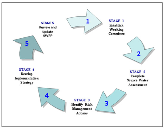 Source water is untreated water from groundwater or surface water sources that supplies drinking water for human consumption. Source water protection (SWP) is a vital first step in the protection of water supplies, often referred to as the first step in the multi-barrier approach to safe drinking water [107]. SWP planning offers a means of addressing land management problems in order to protect drinking water quality [108]. The SWP planning process used in the study areas adopted a five-stage planning framework (Figure 2) [109]. This planning framework represents a structured, rational planning approach for the specific purpose of supporting First Nations with drinking-water protection.