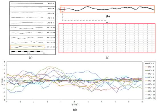 Originating from the difficulties in characterizing the roughness, Barton et al. [28] introduced the joint roughness coefficient (JRC) to investigate the mechanical and hydraulic behaviors of jointed rock mass. The JRC is obtained from the comparison between the given profiles with the standard profile shown in Figure 1a. The proposed parameter has the advantage of being easily obtained in practice, and thus it is widely used to characterize the geometry of fracture profiles. The process to obtain the height of the profiles for Barton’s standard profiles are demonstrated in Figure 1, in which, a profile with a certain JRC value is extracted (Figure 1b) and binarized according to the threshold value that is distinguished in the solid line (black) and background (white) (Figure 1c). After that, the height of different locations (x) is obtained as shown in Figure 1d.