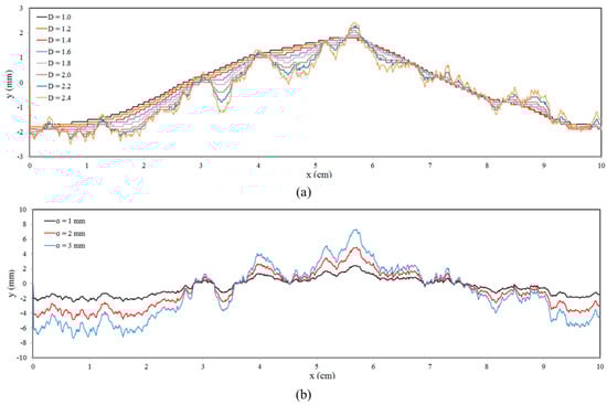Profiles for synthetic fractures with different fractal dimensions and standard deviations: (a) profiles of different fractal dimensions with standard deviations of 1 mm; (b) profiles with different standard deviations at a fractal dimension of 2.4.