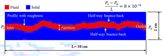 The influence of roughness on fluid flow is investigated through the two-dimensional incompressible LBGK model. To this end, the 2D profile of fracture surface is imported to the LBM so as to generate a fractured model as shown in Figure 3. The length of the fractured model is set as 10 cm to keep it consistent with a realistic profile. The aperture between two parallel rough profiles varies from 0.1 to 0.4 cm and the height of the fractured model is kept constant at 2 cm so that the full fracture would be in the range of the model domain. The pressure is applied at the inlet and outlet of the fracture and the “half-way wall bounce-back” scheme is used to simulate the non-slip boundary at the fluid–solid interface [31].