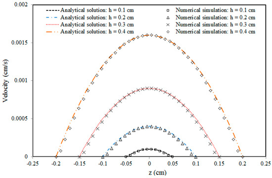 The comparison between the analytical solution and numerical simulation for fluid flow through the parallel plate model with different apertures.