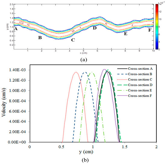 The LBM is further validated for the fluid flow through fractures with roughness, the rough profile with JRC = 17~18 is imported to the LBM, and the aperture is set as 0.4 cm. With the same boundary condition and parameters, the velocity distribution is obtained as shown in Figure 5a, and the velocity profiles at different cross sections (A~E) are monitored, which are presented in Figure 5b.