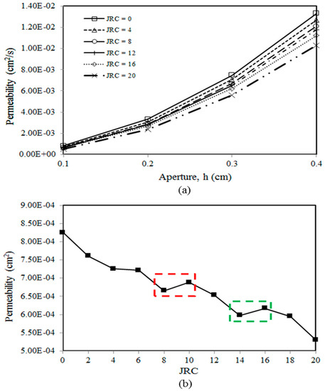 Accordingly, f is calculated for each of the simulation results, which is presented in Figure 6b. It was found that the correction factor decreases with the increase in the JRC and increases with aperture. However, it is noticed that an unrealistic trend has been observed in the red and green rectangular zones from Figure 6b, in which, a larger JRC value presents a higher correction factor (or permeability).