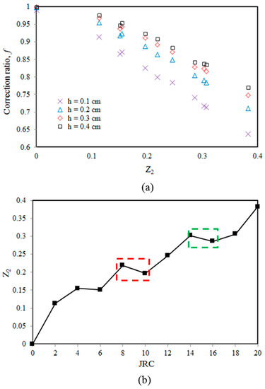 The relationship between the correction factor, the JRC and Z2: (a) relationship between Z2 and the JRC, (b) relationship between the correction factor and Z2.