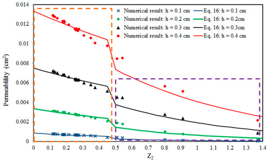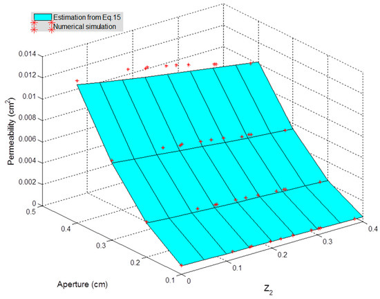 To this end, the relationship between permeability, Z2 and aperture is summarized in the k-Z2-h space in Figure 8, and a good agreement has been observed from the comparison between the numerical simulation and the proposed equation.