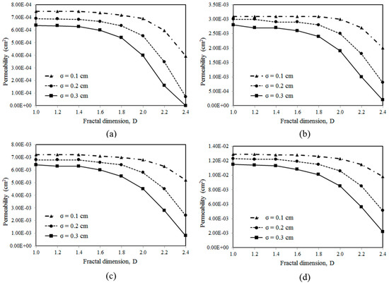 The influence of fractal dimension and standard deviation on the permeability of a single fracture: (a) aperture = 0.1 cm; (b) aperture = 0.2 cm; (c) aperture = 0.3 cm; (d) aperture = 0.4 cm.