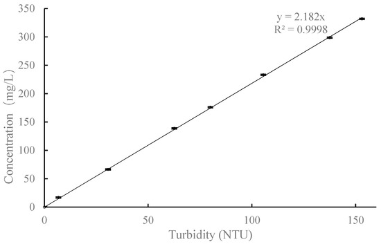 Water samples were collected to investigate the distributions of the aqueous SP. The clean water infiltration stage lasted about 8 h (from 48 to 56 h), and the stormwater infiltration stage lasted about 43 h (from 56 to 99 h, see the Results section). But the measurements continued even when the stormwater infiltration stage ended, and the last measurement was conducted when the time was 124 h. The turbidimeter determines the turbidity level by measuring the amount of light scattered at 90 by the suspended particles. The measurements are converted and displayed in Nephelometric Turbidity Units (NTU). The measurement range of the turbidimeter is from 0.1 to 200 NTU. The particle concentrations of the samples were determined with the help of correlations between SP concentrations in water and NTUs (Figure 2).