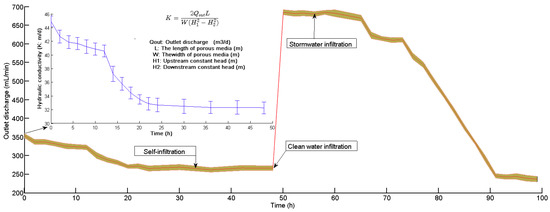 Evolution of outlet discharge rate during the whole experiment, including self-filtration stage (no water infiltration, and only the results of last two days are presented here); clean water infiltration stage; and stormwater infiltration (red and blue lines represent median values and orange area represents 95% confidence interval). Hydraulic conductivity (K) was calculated by the application of the Dupuit discharge formula.