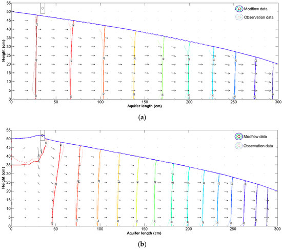 Simulated groundwater flow (solid line) of the sand tank model by MODFLOW and actual groundwater flow (dotted line) interpolated by data from pressure sensors. (a) Self-filtration stage. (b) Clean water infiltration stage. The arrow size indicates the velocity of the water flow.