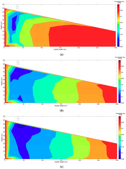 The permeability reduction of the porous medium over time due to particle deposition was assessed by Kozeny-Carman equation. The effects of re-arrangement of aquifer itself was excluded in the self-filtration and the permeability reduction of the aquifer was caused by deposited SP. Figure 7 shows the spatial distribution of permeability within the aquifer at the early and late stage of stormwater infiltration. The permeability of initially uniform porous medium was obtained using Dupuit formula. The spatial distribution of the permeability became non-uniform after the SP infiltration (Figure 7a). And the permeability of non-uniform porous medium was estimated by Kozeny-Carman Equation (8) in conjunction with other relevant Equations (3)–(7). The permeability dropped obviously below filtration basin. At early stage, vertical flow with relatively high flow rates (Figure 4) carried SP into deeper length, but as the gradually formed clogging layer restricted the vertical flow, the worst reduction zone of permeability was limited to area around the infiltration basin, where permeability of porous medium is equal to 65% of the initial permeability. Thus, it was the top of the porous medium that was the most active in the deposition process, and decreased with length. This distribution of non-uniform permeability reduction increased as stormwater infiltration continued, and the scope of permeability reduction zone extended both downward and rightward (Figure 7c). The horizontal hydraulic gradient might contribute to the SP transport, as permeability reduction distribution occurred along the gradient around the water table. It is worth noting that the aquifer bottom (x = 50 cm) suffered relatively more permeability reduction at the end of the stormwater infiltration, which suggests gravity still significantly affected the trajectories of the SP. At low infiltration rates, the deposition of larger SP was mainly controlled by gravity, causing them to settle to the bottom of the tank [9].