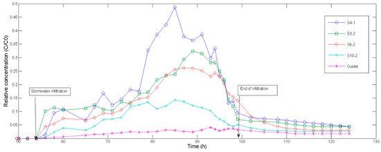 To investigate the effects of the horizontal gradient on the transport and deposition of SP, the BTCs (Figure 8) are represented by a relative concentration as a function of time. Two obvious features can be seen from the figure. One is the high fluctuations of BTCs, as compared to results in sand column [9,13,15]. These fluctuations are similar to variations in head losses (Figure 6). The other is the extended tailing following breakthrough. It is particularly evident for outlet BTC, where persistent low concentrations could be detected, even a long period after the experiment ended.