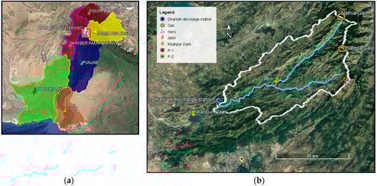 (a) Location of Haro River watershed in Pakistan; (b) main features of Haro River watershed.