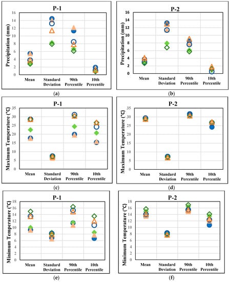 Line up of variation in observed (blue), non-bias corrected (green) and bias corrected (orange) statistical indicators during calibration (filled markers) and validation (hollow markers) periods for (a) precipitation at P-1; (b) precipitation at P-2; (c) maximum temperature at P-1; (d) maximum temperature at P-2; (e) minimum temperature at P-1; (f) minimum temperature at P-2.