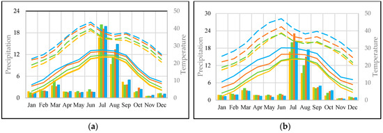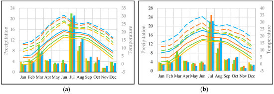 Mean monthly precipitation, maximum and minimum temperature for baseline and future period at P-1 under (a) RCP 4.5; (b) RCP 8.5. (Note: The bars represent the precipitation in mm/day, dashed lines represent maximum temperature in °C and the solid lines represent the minimum temperature in °C. Yellow color represents the baseline period, green color represents the early century, orange color represents the mid-century and the blue color represents the late century).
