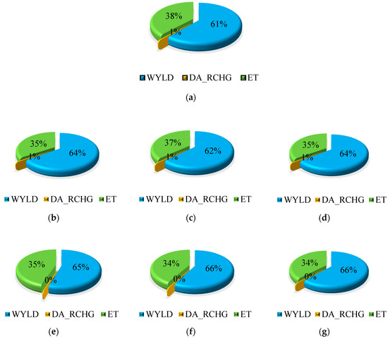 Relative percentages of water balance components under baseline and future periods (a) baseline period; (b) early century RCP 4.5; (c) mid-century RCP 4.5; (d) late century RCP 4.5; (e) early century RCP 8.5; (f) mid-century RCP 8.5; (g) late century RCP 8.5. (Note: WYLD refers to water yield, DA_RCHG refers to deep aquifer recharge and ET refers to evapotranspiration).