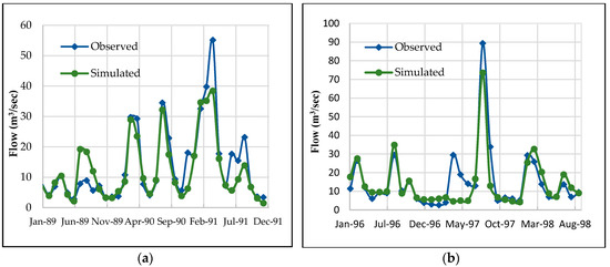 Observed and simulated discharge at Haro River (a) during the calibration period; (b) during validation period.