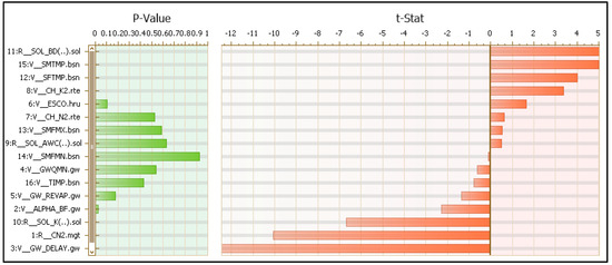 The results of the global sensitivity analysis in SUFI-2 are shown in Figure 7. Based upon least p-value and the largest absolute t-stat, GW_DELAY followed by CN2, SOL_K and SOL_BD were ranked as the most sensitive parameters. This indicated that parameters related to groundwater processes, surface runoff and soil processes have the highest impact on the results of the SWAT model for this particular watershed. A higher value of CN2 indicated its key role in the generation of streamflow for Haro River watershed as CN is used by SWAT to divide precipitation into overland flow or infiltration. For each HRU, surface runoff was generated within SWAT by using SCS-CN method [40].