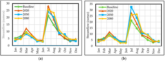 Monthly variation in streamflows of Haro River under (a) RCP 4.5; (b) RCP 8.5.