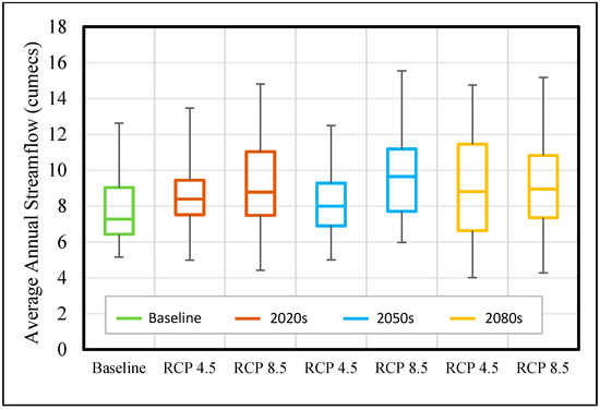 Box and whisker plot for average annual streamflows under RCP 4.5 and RCP 8.5.