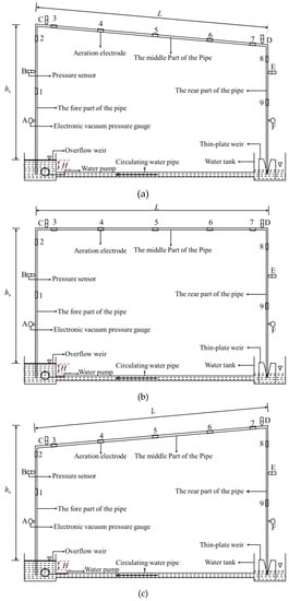 Layout of test devices: (a) pipeline on the positive slope, (b) pipeline on the flat slope, (c) pipeline on the reverse slope.