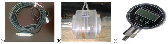 The test device is arranged as shown in Figure 1. The device is composed of an upstream water tank, a siphon pipeline, and a downstream water tank. The siphon pipeline is divided into the fore part, the middle part, and the rear part, all of which are made of glass tubes PMMA so as to facilitate the observation of the test phenomenon. The middle part is placed obliquely with the same length of 18.15 m under various gradients (the gradient is a negative when placed on a reverse slope and a positive on a positive slope). The following devices are arranged in sequence from upper reach to lower reach: Nine ring aeration electrodes (DDLY-2005 type with measurement accuracy of ±0.5%); four pressure sensors (KYB11G/A type with measurement accuracy of ±0.25% FS); two electronic vacuum pressure gauges (PG-801C type with measurement accuracy of ±0.20%). These devices are shown in Figure 2. The test is carried out mainly to measure the magnitude of the pressure of the siphon pipeline, gas fraction of the cross-section, and bubble velocity, etc., under various pipe diameters (2 cm, 3 cm, 6 cm), water heads (35~135 cm), and gradients (approximately ±1/60 to ±1/10) with the constant installation heights of 4 and 6 m, and to observe the gas–liquid two-phase flow in a siphon pipe under different working conditions. The pressure is measured by a pressure sensor and electronic vacuum manometer. The gas fraction of the cross-section is measured by a ring aeration electrode and conductivity meter (DDLY-2005). Finally, the flow is measured by a 20° open triangular thin-plate weir. As shown in Figure 3, the time t taken for bubbles with the same size going through a fixed distance L under different working conditions is recorded, and bubble velocity is calculated in terms of the formula v = L/t. In addition, an HDTV camera is used to record the phenomenon of gas–liquid two-phase flow under various working conditions. Problems on the prototype and model scale are not involved herein since the test is a preliminary study.