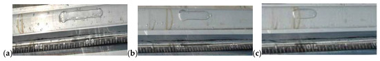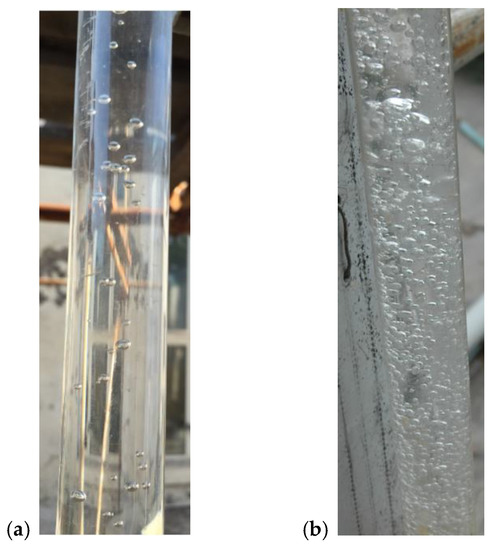 The gas–liquid two-phase flow phenomenon in a siphon pipe under various working conditions is observed in the test, and a typical condition is selected to explain the test phenomenon. Take the 2 cm pipe with the installation height hs = 4 m, the upstream and downstream water level H = 25 cm, and the gradient i = 0 as an example—since the installation height of the siphon pipe is high, there is a large amount of tiny bubbles in the upstream water tank which are insoluble in water and invisible to the naked eye. With the increase of the installation height, the pressure in the fore, middle, and rear parts of the pipe decrease gradually. A small amount of gas nuclei, which are invisible and insoluble in raw water, expand and separate out due to the higher pressure inside the gas nucleus as compared to that outside the gas nucleus, forming bubbles in the pipe. The flow pattern in the siphon pipeline is a gas–liquid two-phase flow. The flow state in the fore part of the siphon pipe is shown in Figure 4a. It can be seen that the bubbles in the fore part of the pipe are small in volume, and quickly flow into the middle part of the pipe after gas evolution. The water flow direction is consistent with the buoyancy direction of the bubbles, so the bubbles flow upward in the same direction as the water flow. The motion law is simple. As shown in Figure 4b, the bubbles in the rear part of the pipe flow down with water at first, and move up and down in groups after siphoning for some time. Therefore, it is difficult to measure the bubble velocity in the rear part of the pipe accurately.