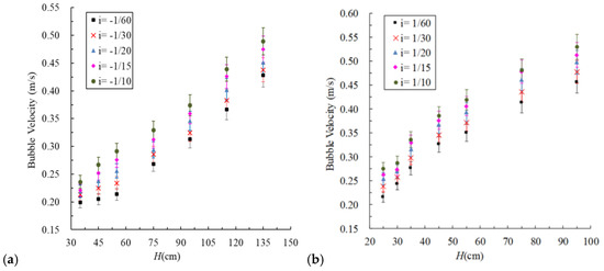 It can also be seen from Figure 7 that bubbles move at a higher speed in the pipe on the positive slope than that on the reverse slope. Because the flow velocity and the Re number increase with the increase of the water head of the pipe, the inertia force acting on the gas–liquid mixture increases and the velocity difference between the water flow and bubbles decreases. The bubble velocity depends on the flow velocity, and the applied force of the water flow on the bubbles is much larger than that of buoyancy. For the pipe on the reverse slope, the component of gravity acting on the gas–liquid mixture, opposite to the inertia force, acts as a negative factor to reduce the velocity of the gas–liquid mixture. Meanwhile, for the pipe on the positive slope, the component of gravity acts in the same direction as the inertia force and thus acts as a positive force to increase its speed, so the velocity of the flow with bubbles in the pipe on the positive slope is higher than that on the reverse slope.