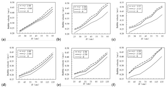 Comparison of the bubble velocity in the middle part of pipe on the positive, flat, and reverse slopes: (a) hs = 4 m and i = ±1/60, (b) hs = 4 m and i = ±1/20, (c) hs = 4 m and i = ±1/15, (d) hs = 6 m and i = ±1/60, (e) hs = 6 m and i = ±1/30, (f) hs = 6 m and i = ±1/10.