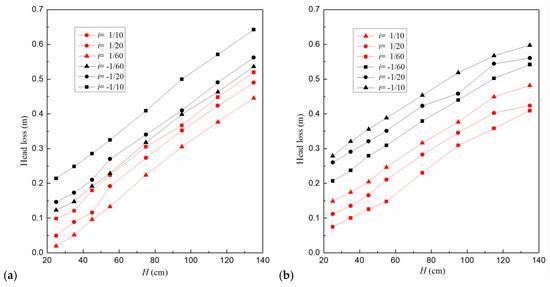It can also be seen from the figure that the head loss of the pipe on the reverse slope is significantly higher than that on the positive slope, which is obviously different from water flow in common pressurized pipelines. The head loss in common pressurized pipelines is independent of the slope. According to the measured result of the gas fraction, when hs and H are constant, the gas fraction of the pipe on the positive slope is about 50% of that on the reverse slope. The head loss is related to not only the flow velocity but also the gas fraction. Water flow carries air mass by means of the drag force, in which process part of the water flow kinetic energy is transformed into air mass kinetic energy, causing a large head loss. In addition, the flow velocity and its inertia force increase with the increase of the water head. For the pipe on the reverse slope, the component of gravity acting on the gas–liquid mixture works opposite to the inertia force, acting as a negative force. Meanwhile, for the pipe on the positive slope, the component of gravity acts in the same direction as the inertia force, as a positive force, so the head loss in the pipe on the reverse slope is higher than that on the positive slope.