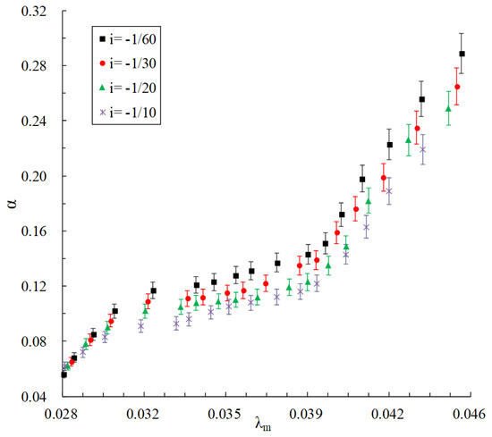 It is found that when Re > 5000, the gas pockets in the pipe are so tiny that the local head loss caused by the gas pockets can be ignored. The calculation formulas for the resistance coefficient (λm) in a siphon pipe with gas–liquid two-phase flow are shown in Formulas (5) and (6), where λm = f (Re, α, I, △/ d). The coefficient of absolute roughness △ in PMMA tubes with various diameters remains constant at 0.0015 mm. The formula of the resistance coefficient is deduced by the test data at d = 2 cm. When d = 2 cm, the relative roughness △/d = 0.000075, which is constant, so the influence of △/d on λm is not considered. This formula is also verified with test data of d = 3 and 6 cm. The resistance coefficient λm in the siphon pipes on the positive slope and the reverse slope with 5000 < Re < 20,000 and the gradient i of approximately ±1/60 to ±1/10 are analyzed on the basis of the test results. Figure 9 shows the relationship between λm and the gas fraction α under various slopes. It is found that when the gas fraction α ≤ 8%, the resistance coefficient λm under various gradients appears in a line, which is independent of the gradient i but related to α, that is, λm = f (Re, α). Bubble flow mostly appears in the pipe, occupying a small area, at which time we only need to measure the gas fraction and amend the flow sectional area in order to calculate the resistance coefficient in liquid-phase full-flow. When the gas fraction 8% < α ≤ 30%, test points corresponding to different gradients emerge in different curves, which indicates that the resistance coefficient λm is not only related to the gas fraction but also the gradient i, that is, λm = f (Re, α, i). When the maximum gas fraction is more than 30% under various working conditions, the gas pockets in the pipe rapidly gather to cut off the water flow, resulting in the failure of the remaining stable siphon. Therefore, this part focuses on the derivation of the formula of the resistance coefficient λm under various gradients on the positive and reverse slopes within the range of 8% < α ≤ 30%.